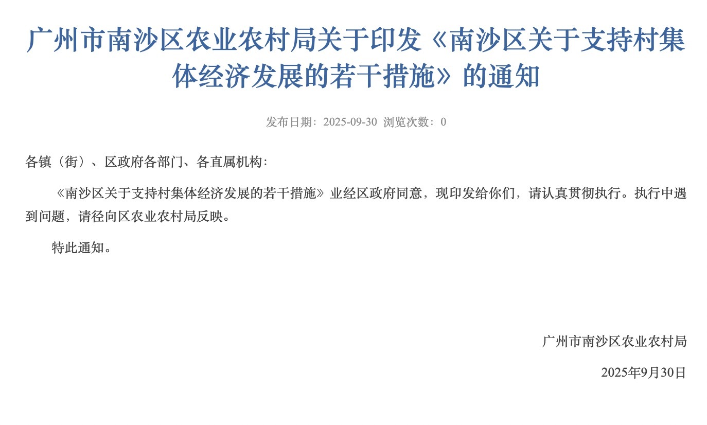 此外,根据“强村十条”,南沙将支持村集体扩大土地流转集约土地,积极引进现代农文旅体项目,对带动村集体经济发展且符合现代农文旅体高质量发展政策的项目,将优先给予财政补助支持。