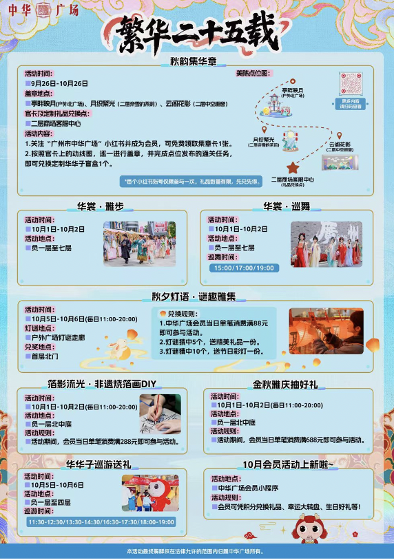 月满中秋,中华广场举办“繁华二十五载”活动,设置庭畔映月、月织繁光、云阁花影等中秋集章打卡点,其中在庭畔映月还可以猜猜灯谜。国庆前两天,带着小朋友体验箔影流光·非遗烧箔画DIY,购物满688元还有金秋雅庆抽好礼。